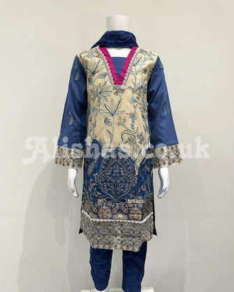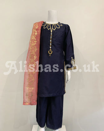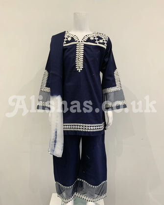 Simrans Navy Girls Embroidered Kameez Suit with Flary Trousers and Chiffon Duppata