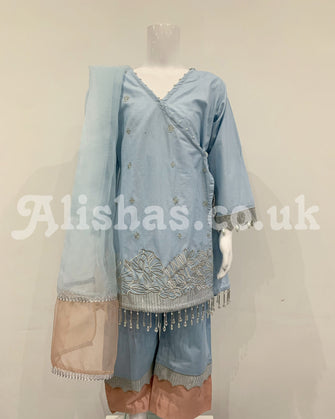 Simrans Pale Blue Girls Embroidered Peplum Suit with Flary Trousers and Net Duppata