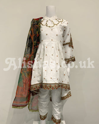 Girls White Contrast Chikan Kameez Suit with Trousers and Chiffon Duppata