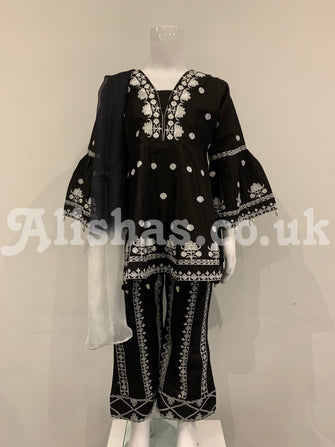 Black Girls Designer Embroidered Cotton Printed Garara Suit with Chiffon Duppata