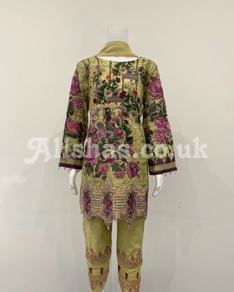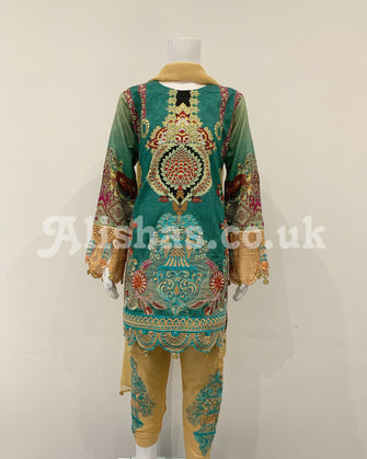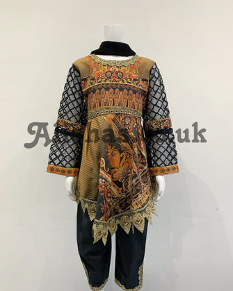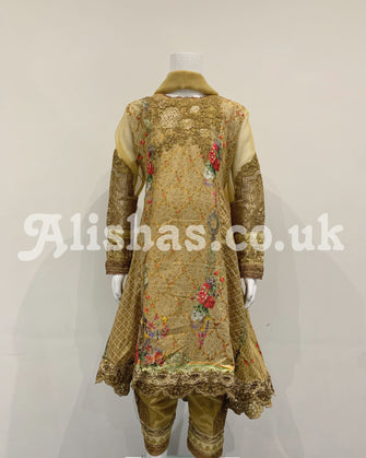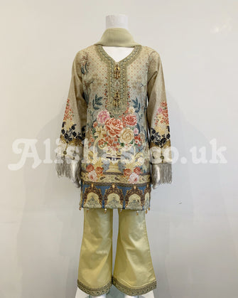 Gold Girls Designer Lawn Dress Suit with Trousers and Net Duppata