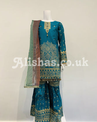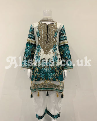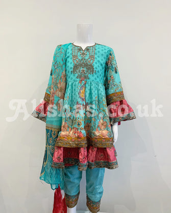 Girls Designer Aqua Floral Kameez Suit with Trousers and Chiffon Duppata
