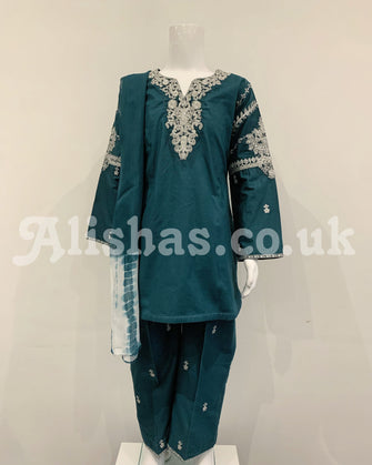 Simrans Teal Girls Embroidered Kameez Suit with Trousers and Chiffon Duppata