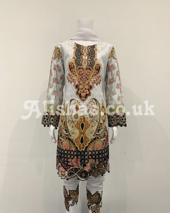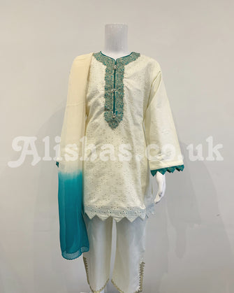 Girls White Contrast Chikan Kameez Suit with Trousers and Chiffon Duppata