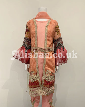 IVANA Girls Designer Peach Jacket Belt Suit with Net Duppata