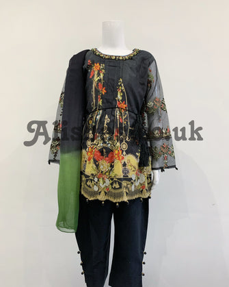 Guddiya Girls Luxury Lawn Black Dress Frock Suit with Net Sleeves, Trousers and two tone chiffon scarf