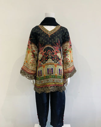 Guddiya Girls Luxury Black Floral Dress Belt Suit with Net Sleeves, Trousers and two tone chiffon scarf
