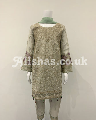 Girls Maze Fancy Embroidered Chiffon Suit With Trousers and Chiffon Duppata