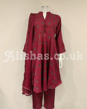 Simrans Deep Red Dhanak Printed Suit with Trousers and Shawl