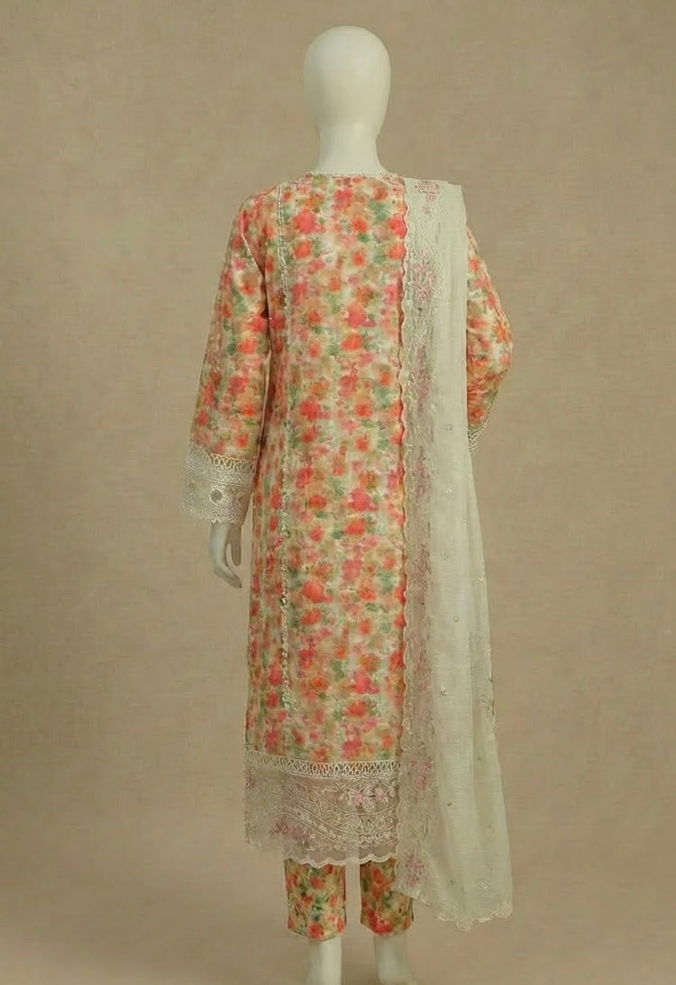 Embrace a charming and elegant aesthetic with this Luxury Printed Lawn Suit. Crafted from breathable, high-quality lawn fabric, this 3-piece Pakistani outfit is designed for comfort and a delightful visual appeal. The shirt features a base color that appears to be a soft cream or light beige, adorned with a vibrant and intricate floral print. The print showcases a beautiful array of flowers in shades of pink, coral, orange, and subtle green accents, creating a lively and feminine look.