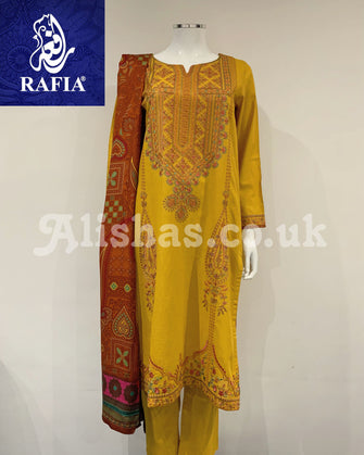RAFIA Designer Pale Mustard Premium Khaddar Embroidered Kameez Suit with Trousers and Premium Large Soft Shawl